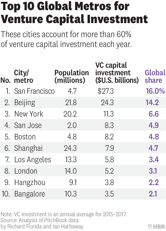 A separate study by one of us and a colleague that looked at the factors associated with venture capital investment across U.S. metros found population size and density to be key. The only other factor that was slightly more important was high-tech industry concentration, which is what entrepreneurs and venture capitalists are aiming to create over the long run.